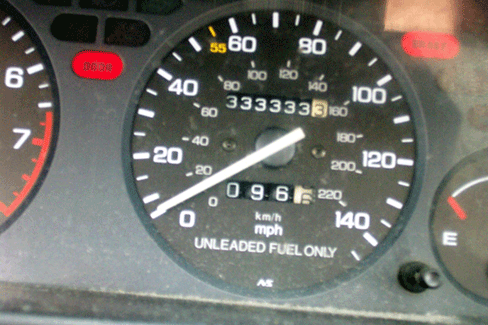 As some of you know, the trusty Kevmobile (a 1991 Acura Integra, if you're keeping score at home) has been with me for many years and many miles. On August 2, 2002, it hit an amazing (literal) milestone: 333,333.3 miles--a third of the way to a million! Here's a picture of the odometer to prove it (no PhotoShop, no doctoring of any kind):